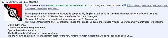 O autor da publicação acertou no nome exato do DLC de Pokémon Scarlet e Violet - The Hidden Treasure of Area Zero - e na descrição dos novos Pokémon Lendários. No final de seu post, ele diz que a empresa está trabalhando em uma atualização para os novos modelos do Nintendo Switch, que serão lançados com a segunda parte do DLC.